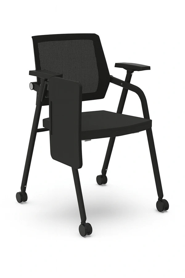 Glass lled nylon mesh back & fabric seat. Multibend seat plywood with PU cushion & PP seat outer. PP armrest with forward- backward movement. M.S oblong powder coated pipe frame chair with castors/ bush.